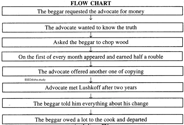 (asked the beggar to chop wood, the beggar requested the advocate for money, the advocate offered another one of copying, advocate met L.ushkoff after two years, the beggar owed a lot to the cook and departed, the advocate wanted to know the truth, the beggar told him everything about his change, on the first of every month, appeared and earned half a rouble.