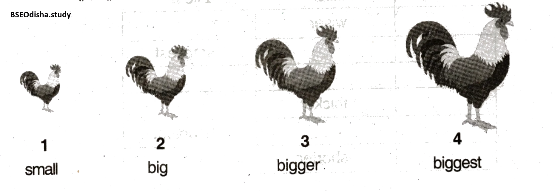 Rooster 1 is small,Rooster 2 is big.Rooster 3 is bigger,Rooster 4 is the biggest